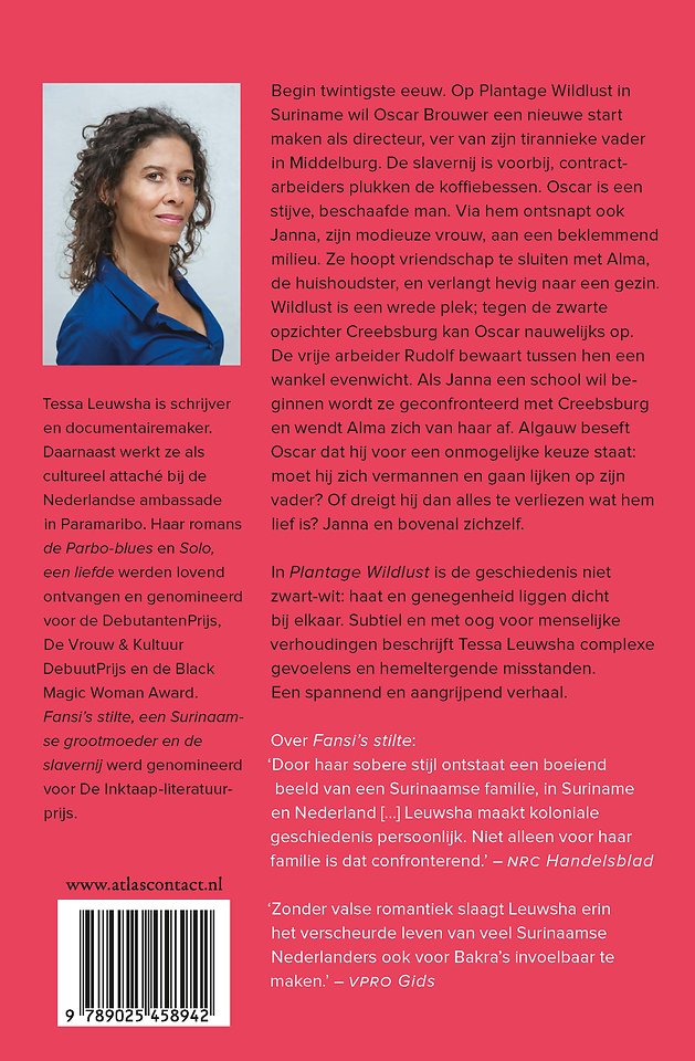 ‘Plantage Wildlust’ van Tessa Leuwsha brengt ons naar begin twintigste eeuw. Op Plantage Wildlust in Suriname wil Oscar Brouwer een nieuwe start maken als directeur, ver van zijn tirannieke vader in Middelburg. De slavernij is voorbij, contractarbeiders plukken de koffiebessen. Oscar is een stijve, beschaafde man. Via hem ontsnapt ook Janna, zijn modieuze vrouw, aan een beklemmend milieu. Ze hoopt vriendschap te sluiten met Alma, de huishoudster, en verlangt hevig naar een gezin. Wildlust is een wrede plek; tegen de zwarte opzichter Creebsburg kan Oscar nauwelijks op. De vrije arbeider Rudolf bewaart tussen hen een wankel evenwicht. Als Janna een school wil beginnen wordt ze geconfronteerd met Creebsburg en wendt Alma zich van haar af. Algauw beseft Oscar dat hij voor een onmogelijke keuze staat: moet hij zich vermannen en gaan lijken op zijn vader? Of dreigt hij dan alles te verliezen wat hem lief is? Janna en bovenal zichzelf.