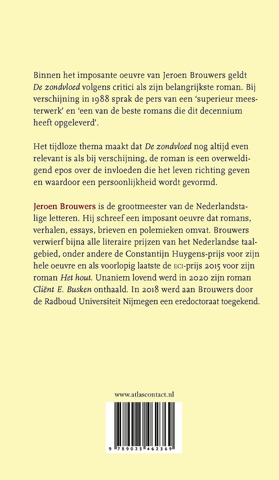 Binnen het imposante oeuvre van Jeroen Brouwers geldt ‘De zondvloed’ volgens critici als zijn belangrijkste roman. ‘De zondvloed’ vertelt het verhaal van een jongen die opgroeit in Indië, zijn verblijf in een Japans gevangenkamp, het eerste contact met meisjes, zijn kostschooljaren in Nederland en uiteindelijk zijn eerste huwelijk. Maar de roman is vooral een overweldigend epos over de invloeden die het leven richting geven en waardoor een persoonlijkheid wordt gevormd.