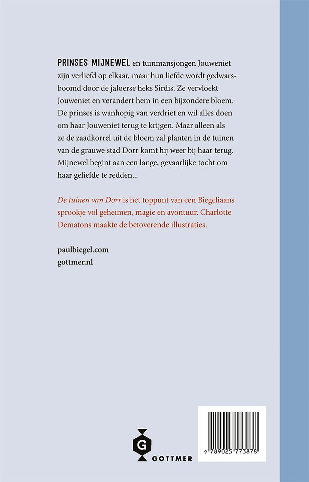 'De tuinen van Dorr' is het toppunt van een sprookje zoals alleen meesterverteller Paul Biegel ze kon schrijven, vol geheimen, magie en avontuur. En dan is het ook nog rijkelijk geïllustreerd door niemand minder dan Charlotte Dematons, die als geen ander de Biegeliaanse sfeer weet te vangen.