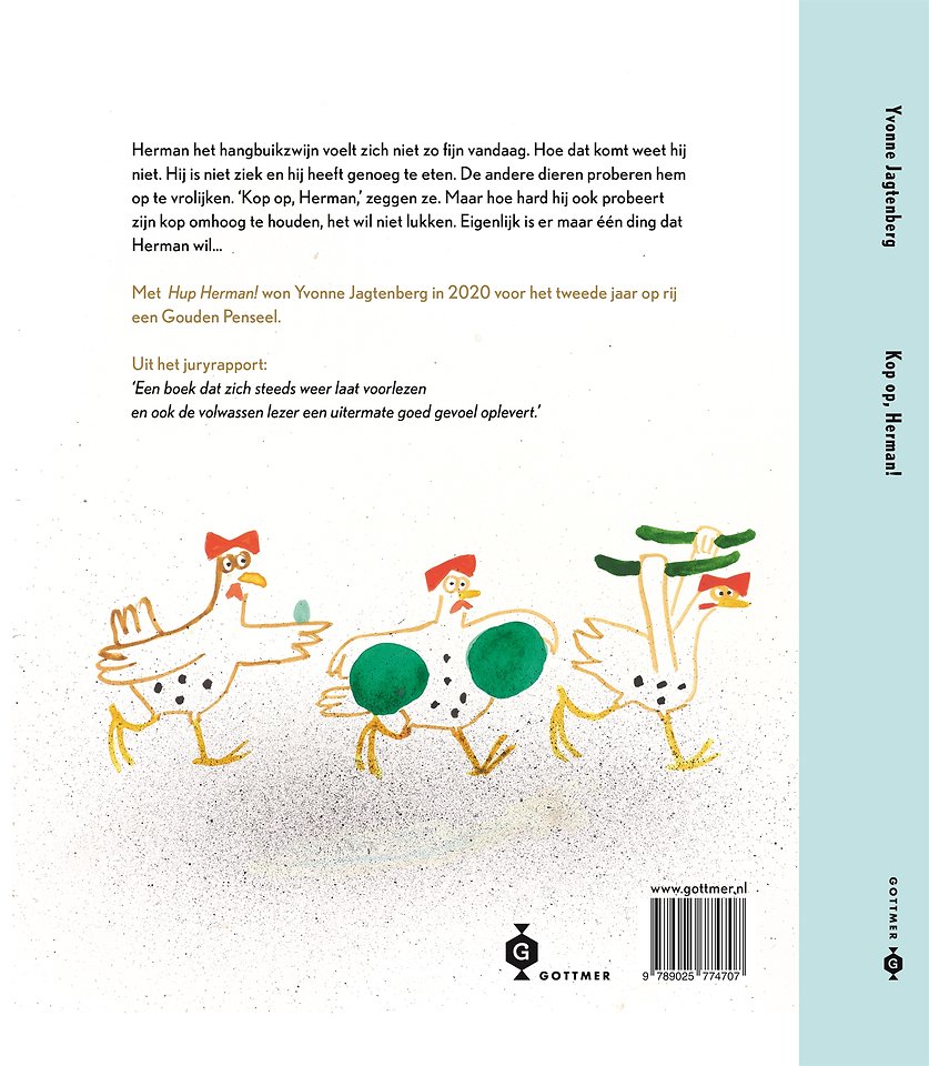 'Kop op, Herman!' is het vervolg op het succesvolle prentenboek 'Hup, Herman!', dat in 2020 een Gouden Penseel won.