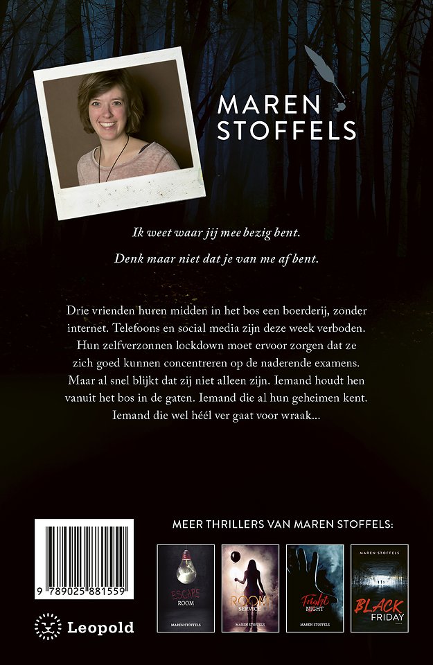 Ik weet waar jij mee bezig bent. Denk maar niet dat je van me af bent. Drie vrienden huren midden in het bos een boerderij, zonder internet. Telefoons en social media zijn deze week verboden. Hun zelfverzonnen lockdown moet ervoor zorgen dat ze zich goed kunnen concentreren op de naderende examens. Maar al snel blijkt dat zij niet alleen zijn. Iemand houdt hen vanuit het bos in de gaten. Iemand die al hun geheimen kent. Iemand die wel héél ver gaat voor wraak...