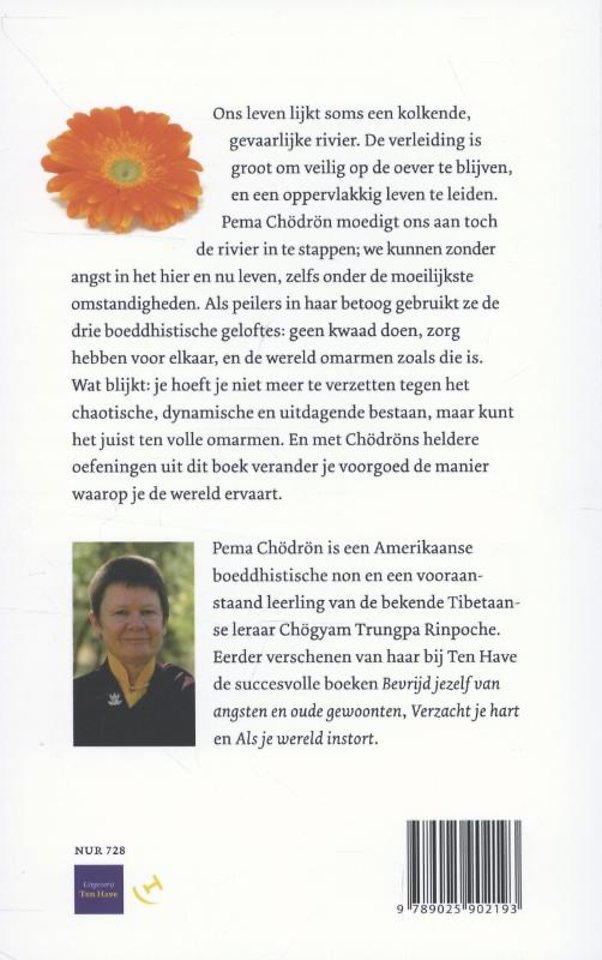 Perna Chadron moedigt ons aan toch de rivier in te stappen; we kunnen zander angst in het hier en nu leven, zelfs onder de moeilijkste omstandigheden. Als peilers in haar betoog gebruikt ze de drie boeddhistische geloftes: geen kwaad doen, zorg hebben voor elkaar, en de wereld omarmen zoals die is. Wat blijkt: u hoeft u niet meer te verzetten tegen het chaotische, dynamische en uitdagende bestaan, maar kunt het juist ten volle omarmen. En met Chadrans heldere oefeningen uit dit boek verandert u voorgoed de manier waarop u de wereld ervaart.