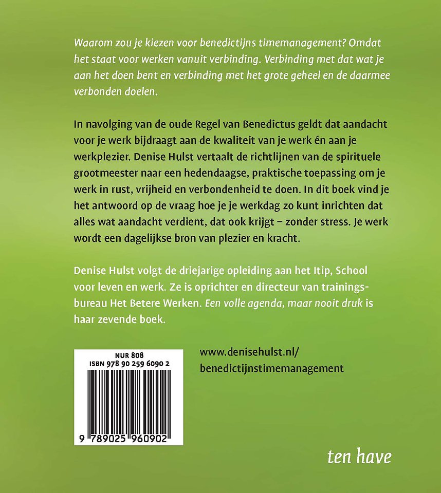 'Een volle agenda, maar nooit druk' heeft een wezenlijk andere benadering. Denise Hulst destilleert richtlijnen uit de wijze geschriften van de spirituele grootmeester Benedictus. Zij vraagt zich af: hoe kun je je werkdag zo inrichten dat alles wat aandacht verdient, dat ook krijgt? En wel zonder dat je in de stress schiet?