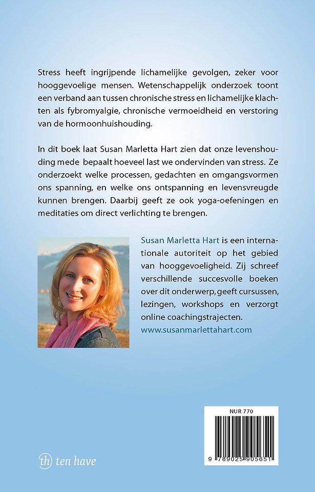 Veel mensen hebben tegenwoordig last van stress, niet alleen hooggevoeligen – hoewel het erop lijkt dat mensen met een hoogsensitieve persoonlijkheid (hsp) er meer last van hebben. Susan Marletta Hart laat zien dat hoe we tegen stress aankijken en hoe we met ons leven omgaan, bepaalt hoeveel last we ondervinden van stress. We kunnen daarom kijken naar stress óf kijken naar levensvreugde. In dit boek onderzoekt Susan welke processen, gedachten en omgangsvormen ons spanning, en welke ons ontspanning en genot kunnen brengen. Daarbij geeft ze ook yoga-oefeningen en meditaties om direct verlichting te brengen.