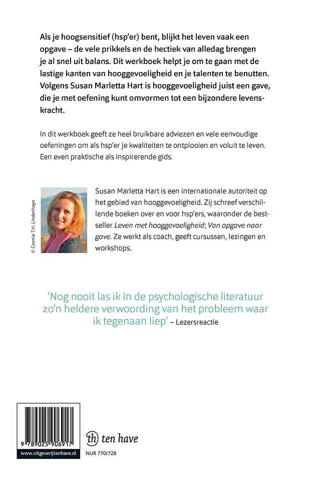 Als je hoogsensitief (hsp’er) bent, blijkt het leven vaak een opgave – de vele prikkels en de hectiek van alledag brengen je al snel uit balans. Dit werkboek helpt je om te gaan met de lastige kanten van hooggevoeligheid en je talenten te benutten. Volgens Susan Marletta Hart is hooggevoeligheid juist een gave, die je met oefening kunt omvormen tot een bijzondere levenskracht.