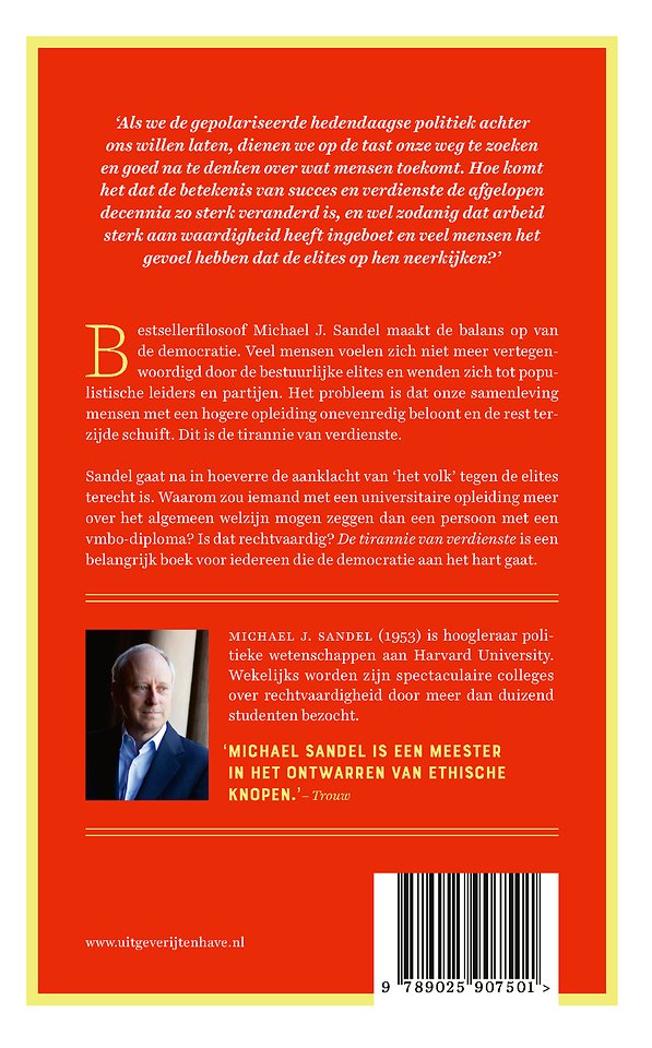 Sandel gaat na in hoeverre de aanklacht van ‘het volk’ tegen de elites terecht is. Waarom zou iemand met een universitaire opleiding meer over het algemeen welzijn mogen zeggen dan een persoon met een vmbo-diploma? Is dat rechtvaardig? 'De tirannie van verdienste' is een belangrijk boek voor iedereen die de democratie aan het hart gaat.