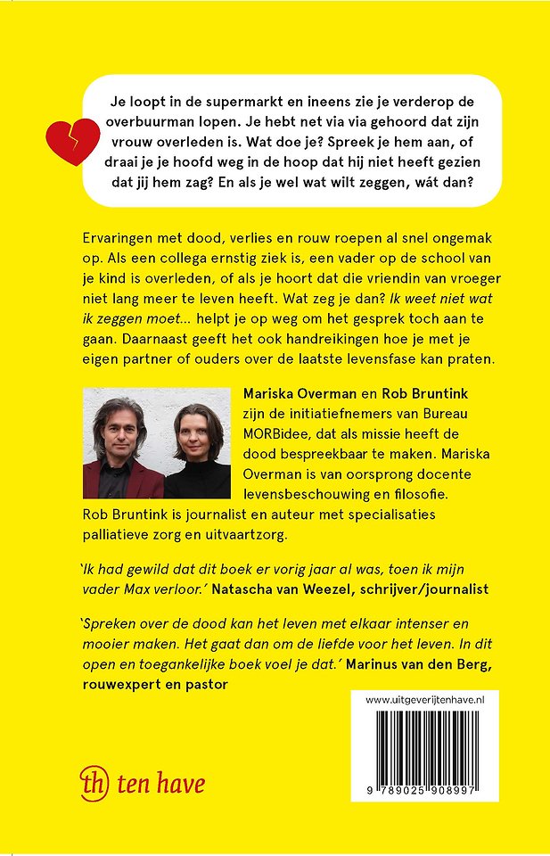 Ervaringen met dood, verlies en rouw roepen al snel ongemak op. Als een collega ernstig ziek is, een vader op de school van je kind is overleden, of als je hoort dat die vriendin van vroeger niet lang meer te leven heeft. Wat zeg je dan? 'Ik weet niet wat ik zeggen moet…' helpt je op weg om het gesprek toch aan te gaan of een troostende schouder te bieden. Daarnaast geeft het ook handreikingen hoe je met je eigen partner of ouders over de laatste levensfase kan praten. Dit boek biedt praktische tips en slimme handvatten om de juiste woorden te vinden en er op het cruciale moment voor de ander te zijn.