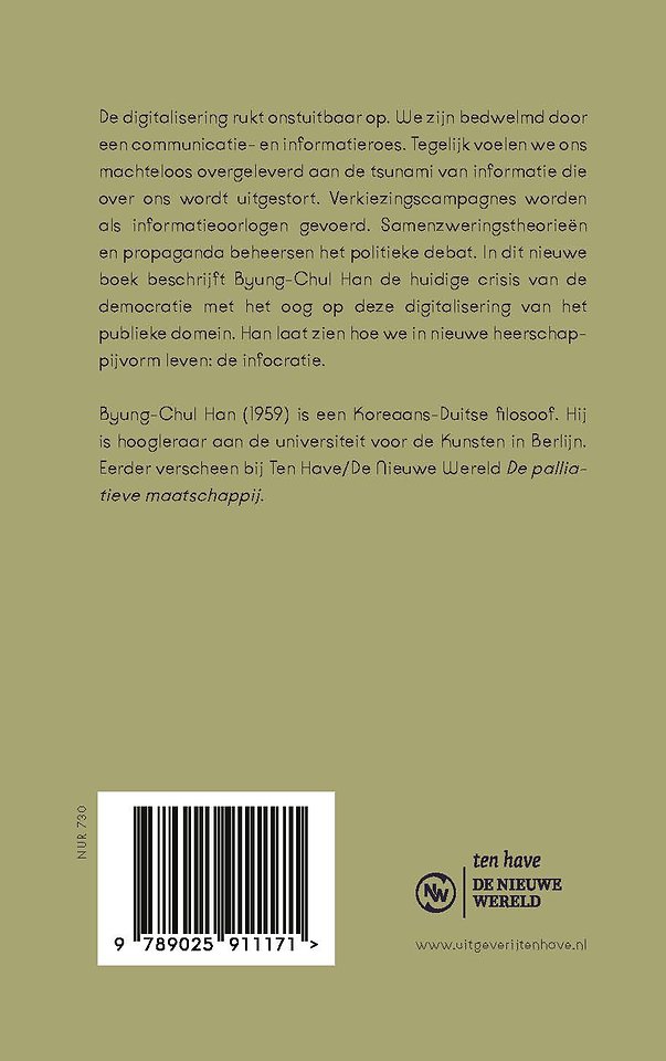 In zijn nieuwe boek ‘Infocratie’ beschrijft Byung-Chul Han de huidige crisis van de democratie met het oog op deze digitalisering van het publieke domein. Han laat zien hoe we in nieuwe heerschappijvorm leven: de infocratie.