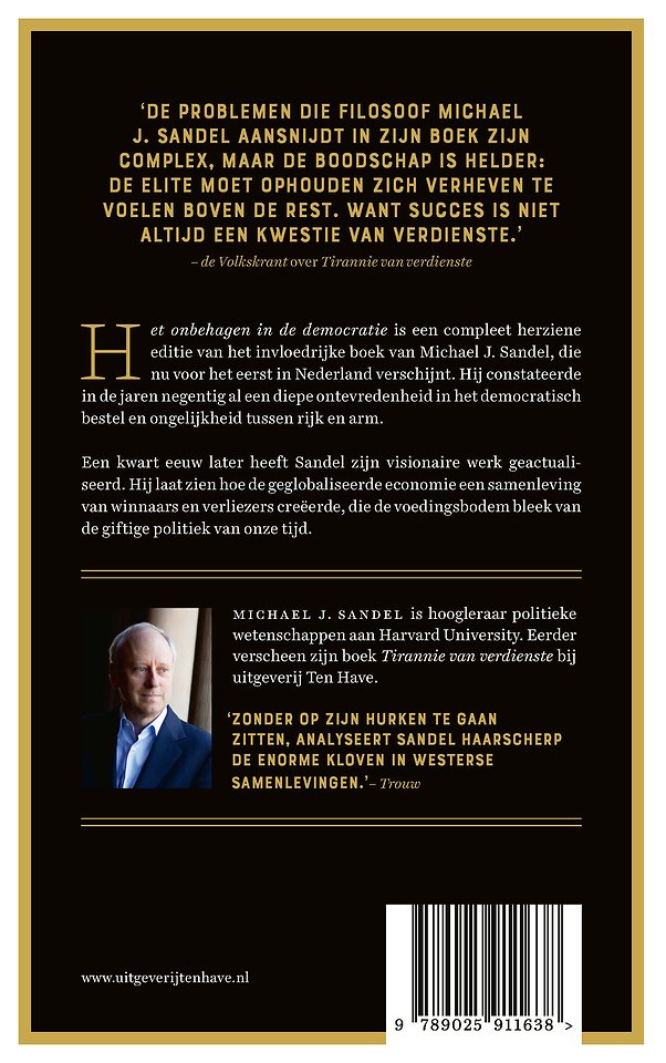 'Het onbehagen in de democratie' is een compleet herziene editie van het invloedrijke boek van Michael J. Sandel. Hij constateerde in de jaren 90 al een diepe ontevredenheid in het democratisch bestel en de ongelijkheid tussen rijk en arm.