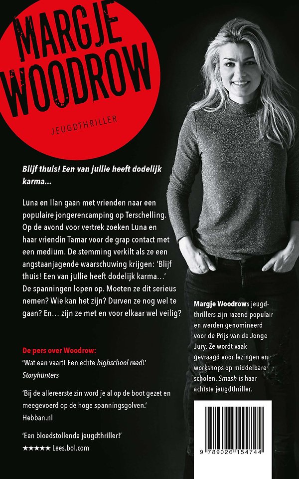 Smash is een actuele en bloedstollende jeugdthriller van Margje Woodrow, voor fans van Mel Wallis de Vries en Cis Meijer. Voor stoere jongens en meiden vanaf 13 jaar. Met POLITIE NIET BETREDEN-elastiek.
