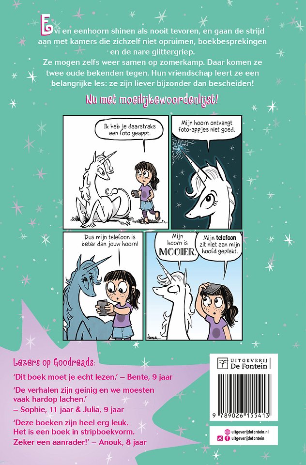 Evi en eenhoorn shinen als nooit tevoren. Zelfs als ze geconfronteerd worden met nare glittergriep en kamers die zichzelf niet opruimen. Basisschoolproblemen en de worsteling om jezelf te zijn, vermengd met narcisme (eenhoorn), sarcasme (Evi) en een vleugje magie. Deze serie is smullen voor heel veel leeftijden.