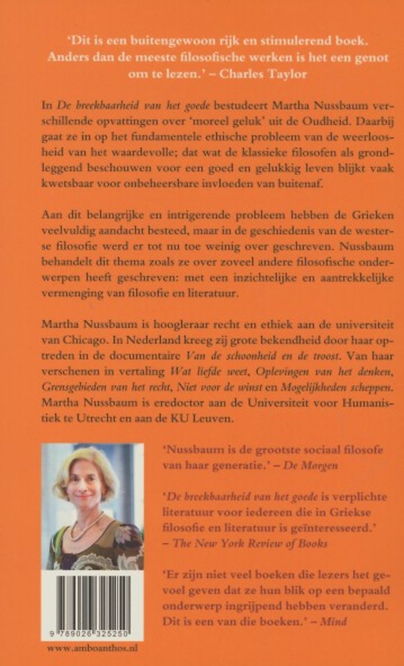 In De breekbaarheid van het goede bestudeert Martha Nussbaum verschillende opvattingen over 'moreel geluk' uit de Oudheid. Daarbij gaat ze in op het fundamentele ethische probleem van de weerloosheid van het waardevolle; dat wat de klassieke filosofen als grondleggend beschouwen voor een goed en gelukkig leven blijkt vaak kwetsbaar voor onbeheersbare invloeden van buitenaf.