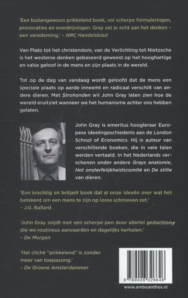 Van Plato tot het christendom, van de Verlichting tot Nietzsche is het westerse denken gebaseerd geweest op het hooghartige en valse geloof in de mens en zijn plaats in de wereld. Tot op de dag van vandaag wordt geloofd dat de mens een speciale plaats op aarde inneemt en radicaal verschilt van andere dieren. Met Strohonden wil John Gray laten zien hoe de wereld eruitziet wanneer we het humanisme achter ons hebben gelaten.