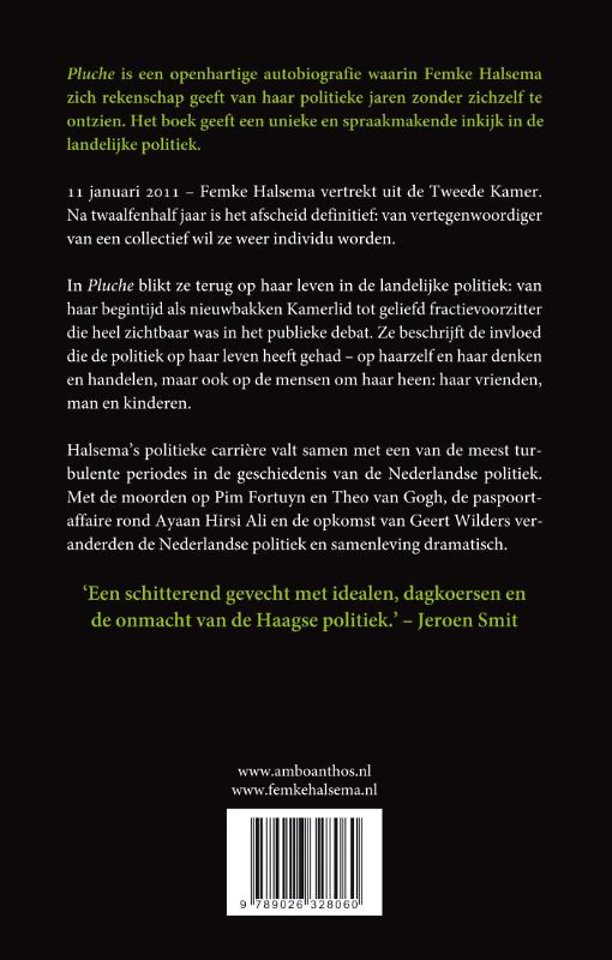 Pluche is de persoonlijke en openhartige autobiografie van Femke Halsema over haar jaren in de landelijke politiek. Van haar hand verschenen eerder de boeken Geluk! Voorbij de hyperconsumptie, haast en hufterigheid en Zoeken naar vrijheid. Halsema is nu werkzaam als publicist, programmamaker en bestuurder.
