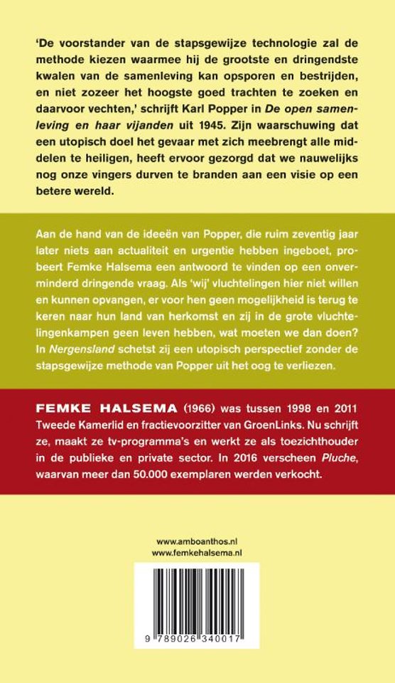 Aan de hand van de ideeën van Popper, die ruim zeventig jaar later niets aan actualiteit en urgentie hebben ingeboet, probeert Femke Halsema een antwoord te vinden op een onverminderd dringende vraag. Als 'wij' vluchtelingen hier niet willen en kunnen opvangen, er voor hen geen mogelijkheid is terug te keren naar hun land van herkomst en zij in de grote vluchtelingenkampen geen leven hebben, wat moeten we dan doen? In 'Nergensland' schetst zij een utopisch perspectief zonder de stapsgewijze methode van Popper uit het oog te verliezen.