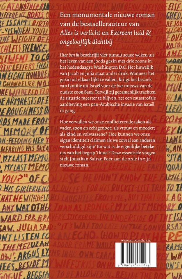 Hier ben ik is Foers eerste roman sinds 2005. Dit monumentale boek is geschreven met de intensiteit, inventiviteit en urgentie die zijn twee eerdere romans zo geliefd maakten bij lezers en critici.
