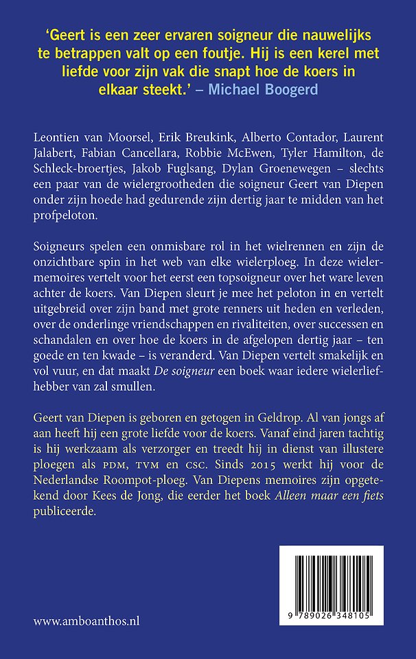 In zijn dertigjarige loopbaan bij het profpeloton begeleidde Geert van Diepen onder andere Leontien van Moorsel, Erik Breukink, Alberto Contador, Andy Schleck, Fabian Cancellara, Tyler Hamilton en Dylan Groenewegen. Soigneurs spelen een onmisbare rol in het wielrennen en zijn de onzichtbare spin in het web van elke wielerploeg: ze regelen de voedselbevoorrading, staan langs de kant met proviand, masseren de stramme benen na de finish en zorgen voor voldoende slaapplekken in de hotels. Om hun renners van dienst te kunnen zijn in het heetst van de strijd moeten ze beschikken over stalen zenuwen, een luisterend oor en verzegelde lippen – want, ja, als soigneur zie en hoor je soms dingen die het daglicht moeilijk kunnen verdragen.