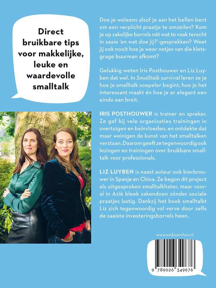 Gelukkig weten Iris Posthouwer en Liz Luyben dat wel. In Smalltalk survival leren ze je hoe je smalltalk soepeler begint, hoe je het interessant maakt én hoe je er elegant een einde aan breit.