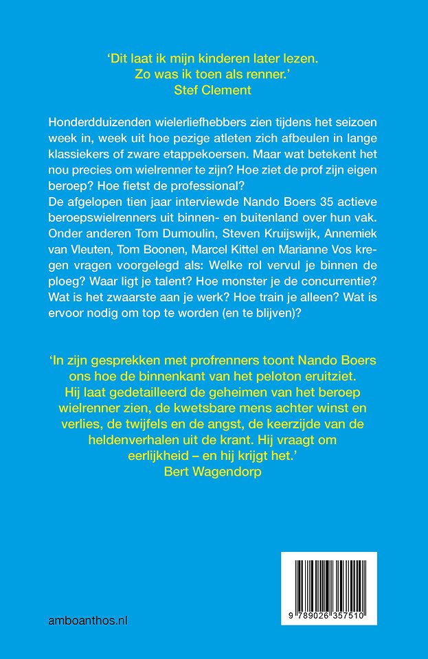 Afgelopen jaren interviewde Nando Boers vijfendertig actieve beroepswielrenners uit binnen- en buitenland. Onder andere Tom Dumoulin, Steven Kruijswijk, Tom Boonen en Marianne Vos kregen vragen voorgelegd als: Welke rol vervul je? Waar ligt je talent? Hoe lig je in de groep? Hoe train je alleen? Wat is er nodig om top te zijn? De interviews werden eerder gepubliceerd in wielertijdschrift De Muur en worden nu – naar voorbeeld van de schrijversinterviews in The Paris Review – gebundeld in een uniek standaardwerk.