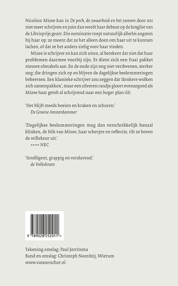 Nicolien Mizee kan in De pech, de zwaarheid en het zweven door rsi niet meer schrijven en juist dan wordt haar debuut op de longlist van de Librisprijs gezet. Die nominatie roept natuurlijk allerlei angsten bij haar op: ze meent dat ze het alleen doen om haar uit te kunnen lachen, of dat ze het anders zielig voor haar vinden. Mizee is schrijver en kan zich uiten, al betekent dat niet dat haar problemen daarmee voorbij zijn. Er dient zich een fraai pakket nieuwe obstakels aan. En de oude zijn nog niet verdwenen, sterker nog: die dringen zich op en blijven de dagelijkse beslommeringen