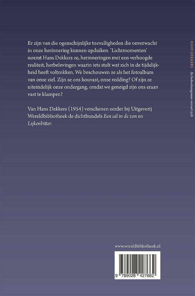 Er zijn van die ogenschijnlijke toevalligheden die onverwacht in onze herinnering kunnen opduiken. ‘Lichtmomenten’ noemt Hans Dekkers ze, herinneringen met een verhoogde realiteit, herbelevingen waarin iets stolt wat zich in de tijdelijkheid heeft voltrokken. We kijken om naar deze momenten, beelden, voorwerpen of visioenen, zoals Orpheus omkeek naar zijn Eurydice. We beschouwen ze als het fotoalbum van onze ziel. Zijn ze ons houvast, onze redding? Of zijn ze uiteindelijk onze ondergang, omdat we geneigd zijn ons eraan vast te klampen?