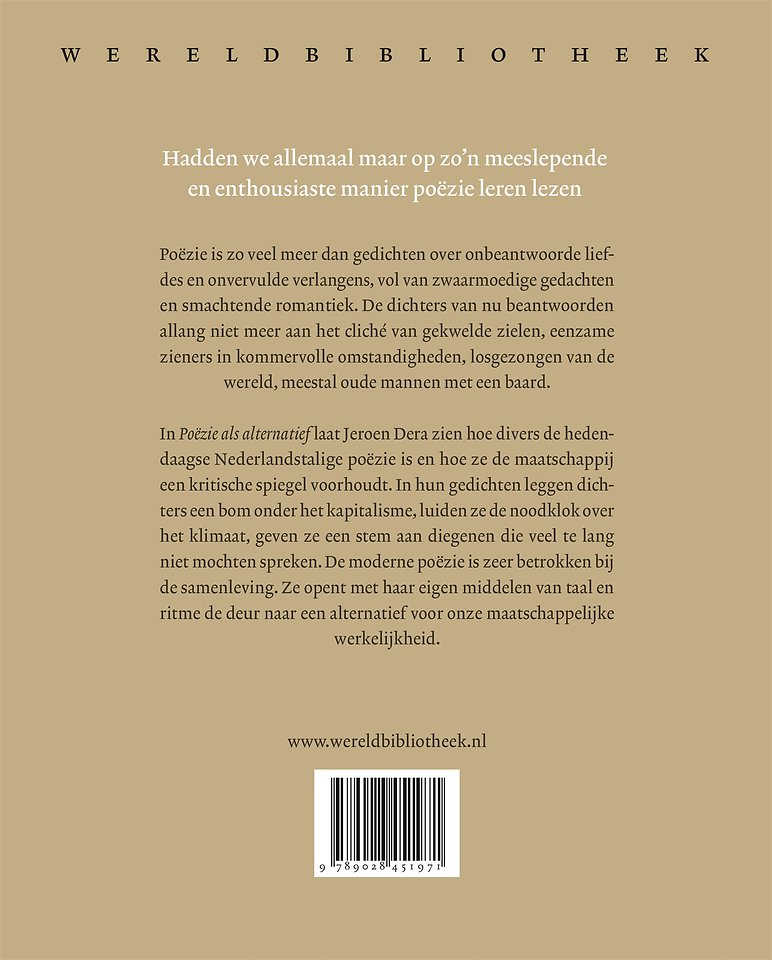 Het grote publiek associeert gedichten nog vaak met de romantiek van onbeantwoorde liefdes, zwaarmoedige gedachten, onvervulde verlangens, en ziet de schrijvers van de gedichten als gekwelde zielen, eenzame zieners in kommervolle omstandigheden, losgezongen van de wereld, meestal oude mannen met een baard. In Poëzie als alternatief maakt Jeroen Dera korte metten met deze clichés. Hij laat zien hoe divers de hedendaagse Nederlandstalige poëzie is en hoe ze de maatschappij een kritische spiegel voorhoudt. In hun gedichten leggen dichters een bom onder het kapitalisme, luiden ze de noodklok over het klimaat, geven ze een stem aan diegenen die veel te lang niet mochten spreken. De moderne poëzie is juist zeer betrokken bij de maatschappij. Ze opent met haar eigen middelen van taal en ritme de deur naar een alternatief voor onze politieke werkelijkheid. Hadden we allemaal maar op zo'n meeslepende en enthousiaste manier poëzie leren lezen.