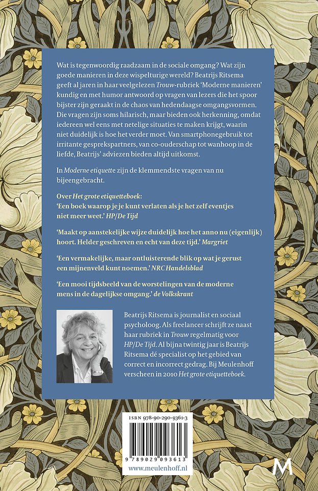 Na haar succesvolle Het grote etiquetteboek is er alweer zoveel veranderd in de maatschappij dat het tijd wordt voor een nieuwe uitgave, met nieuwe vragen en dilemma’s. Wat is tegenwoordig raadzaam in de sociale omgang? Beatrijs Ritsema geeft al jaren in haar veelgelezen Trouw-rubriek ‘Moderne manieren’ kundig antwoord op vragen van lezers die het spoor bijster zijn geraakt in de chaos van hedendaagse omgangsvormen.