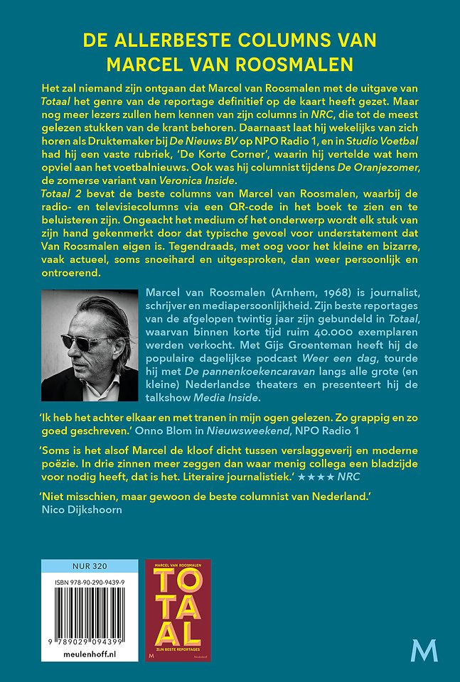 Het zal niemand zijn ontgaan dat Marcel van Roosmalen met de uitgave van Totaal het genre van de reportage definitief op de kaart heeft gezet. Maar nog meer lezers zullen hem kennen van zijn columns in NRC, die tot de meest gelezen stukken van de krant behoren. Daarnaast laat hij wekelijks van zich horen als Druktemaker bij De Nieuws BV op NPO Radio 1, en in Studio Voetbal had hij een vaste rubriek, ‘Korte Corner’, waarin hij vertelde wat hem opviel aan het voetbalnieuws. Ook was hij columnist tijdens De Oranjezomer, de zomerse variant van Veronica Inside.