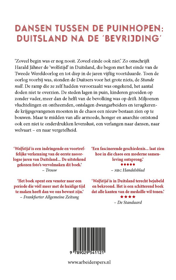 ‘Zoveel begin was er nooit eerder, zoveel einde ook niet.’ Zo omschrijft Harald Jähner de ‘wolfstijd’ in Duitsland, die begon met het einde van de Tweede Wereldoorlog en tot diep in de jaren vijftig voortduurde. Toen de oorlog voorbij was, stonden de Duitsers voor het grote niets, de Stunde null. De ramp die ze zelf hadden veroorzaakt was ongekend. Velen hadden het niet overleefd. De steden lagen in puin, kinderen groeiden op zonder vader, meer dan de helft van de bevolking was op drift. Miljoenen vluchtelingen en ontheemden, ontslagen dwangarbeiders en terugkerende krijgsgevangenen moesten in de chaos een nieuw bestaan zien op te bouwen. Maar te midden van alle armoede, honger en anarchie ontstond ook een niet te onderdrukken levenslust, een verlangen naar dansen, naar welvaart – en naar vergetelheid.