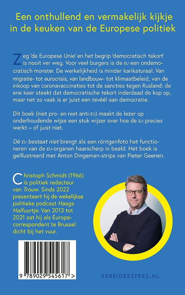 Dé EU bestaat niet brengt als een röntgenfoto het functioneren van de EU-organen haarscherp in beeld. Het boek is geïllustreerd met Anton Dingeman-strips van Pieter Geenen.