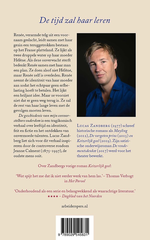 De geschiedenis van mijn onvoorstelbare ouderdom is een tragikomisch verhaal over leeftijd en identiteit, feit en fictie en het ontdekken van onvermoede talenten. Lucas Zandberg liet zich voor dit verhaal inspireren door de controverse rondom Jeanne Calment (1875-1997), de oudste mens ooit.