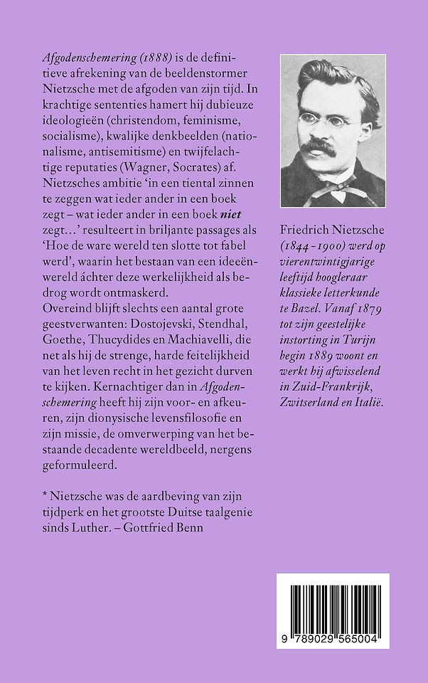 Afgodenschemering (1888) is de definitieve afrekening van de beeldenstormer Nietzsche met de afgoden van zijn tijd. In krachtige sententies hamert hij dubieuze ideologieën (christendom, feminisme, socialisme), kwalijke denkbeelden (nationalisme, antisemitisme) en twijfelachtige reputaties (Wagner, Socrates) af. Nietzsches ambitie ‘in een tiental zinnen te zeggen wat ieder ander in een boek zegt – wat ieder ander in een boek niet zegt…’ resulteert in briljante passages als ‘Hoe de ware wereld ten slotte tot fabel werd’, waarin het bestaan van een ideeënwereld áchter deze werkelijkheid als bedrog wordt ontmaskerd.