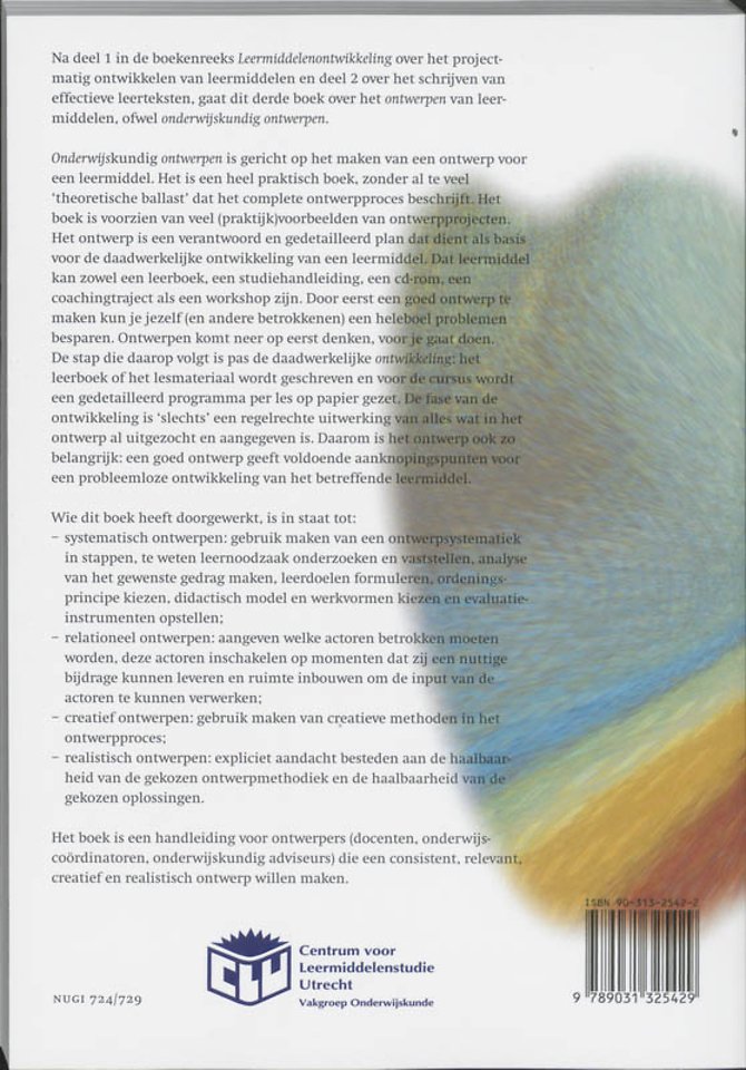 Dit boek is gericht op het maken van een ontwerp voor een leermiddel. Het is een praktisch boek, zonder teveel theoretische ballast dat het complete ontwerpproces beschrijft. Het ontwerp is een verantwoord en gedetailleerd plan dat dient als basis voor de daadwerkelijke ontwikkeling van een leermiddel. Dat leermiddel kan zowel een leerboek, een studiehandleiding, een cd-rom, een coachingtraject als een workshop zijn. Door eerst een goed ontwerp te maken kun je jezelf (en andere betrokkenen) een heleboel problemen besparen.