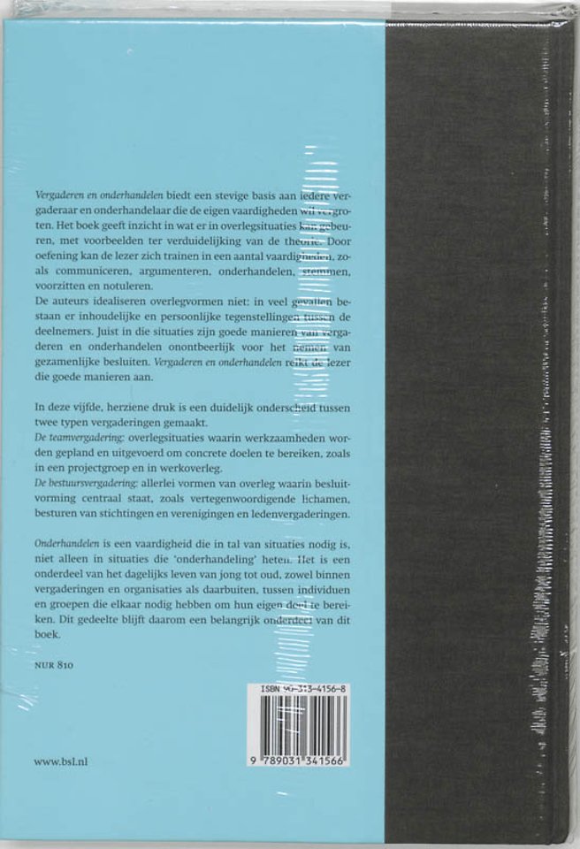 'Vergaderen en onderhandelen', biedt een stevige basis aan iedere vergaderaar en onderhandelaar die de eigen vaardigheden wil vergroten. Het geeft inzicht in wat er in overlegsituaties kan gebeuren, met voorbeelden ter verduidelijking van de theorie. Door oefening kan de lezer zich trainen in een aantal vaardigheden, zoals communiceren, argumenteren, onderhandelen, stemmen, voorzitten en notuleren.
