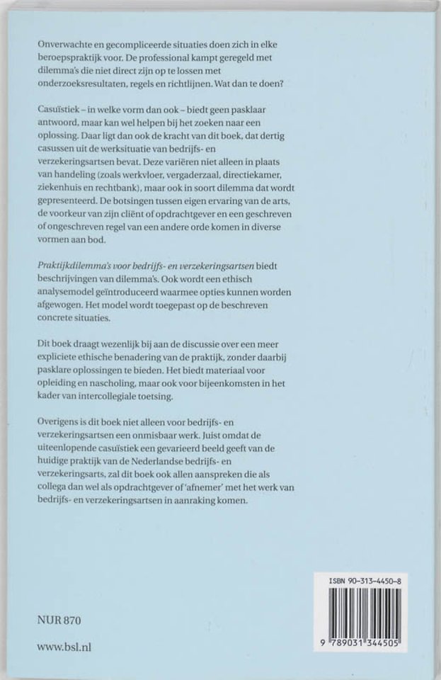 Onverwachte en gecompliceerde situaties doen zich in elke beroepspraktijk voor. De professional kampt geregeld met dilemma's die niet direct zijn op te lossen met onderzoeksresultaten, regels en richtlijnen. Wat dan te doen? Casuïstiek – in welke vorm dan ook – biedt geen pasklaar antwoord, maar kan wel helpen bij het zoeken naar een oplossing. Daar ligt dan ook de kracht van dit boek, dat dertig casussen uit de werksituatie van bedrijfs– en verzekeringsartsen bevat. Deze variëren niet alleen in plaats van handeling (zoals werkvloer, vergaderzaal, directiekamer, ziekenhuis en rechtbank), maar ook in soort dilemma dat wordt gepresenteerd. De botsingen tussen eigen ervaring van de arts, de voorkeur van zijn cliënt of opdrachtgever en een geschreven of ongeschreven regel van een andere orde komen in diverse vormen aan bod. Praktijkdilemma's voor bedrijfs– en verzekeringsartsen biedt beschrijvingen van dilemma's. Ook wordt een ethisch analysemodel geïntroduceerd waarmee opties kunnen worden afgewogen. Het model wordt toegepast op de beschreven concrete situaties. Dit boek draagt wezenlijk bij aan de discussie over een meer expliciete ethische benadering van de praktijk, zonder daarbij pasklare oplossingen te bieden. Het biedt materiaal voor opleiding en nascholing, maar ook voor bijeenkomsten in het kader van intercollegiale toetsing.Dit boek draagt wezenlijk bij aan de discussie over een meer expliciete ethische benadering van de praktijk, zonder daarbij pasklare oplossingen te bieden. Het biedt materiaal voor opleiding en nascholing, maar ook voor bijeenkomsten in het kader van intercollegiale toetsing.