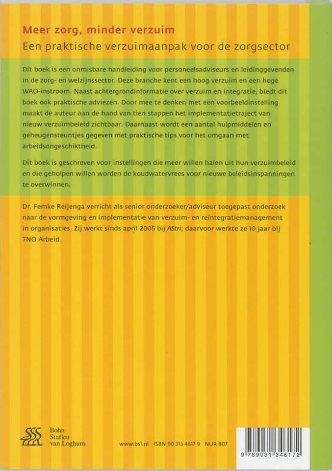 Dit boek is een onmisbare handleiding voor personeelsadviseurs en leidinggevenden in de zorg- en welzijnssector. Deze branche kent een hoog verzuim en een hoge WAO-instroom. Naast achtergrondinformatie over verzuim en integratie, biedt dit boek ook praktische adviezen. Door mee te denken met een voorbeeldinstelling maakt de auteur aan de hand van tien stappen het implementatietraject van nieuw verzuimbeleid zichtbaar. Daarnaast wordt een aantal hulpmiddelen en geheugensteuntjes gegeven met praktische tips voor het omgaan met arbeidsongeschiktheid.