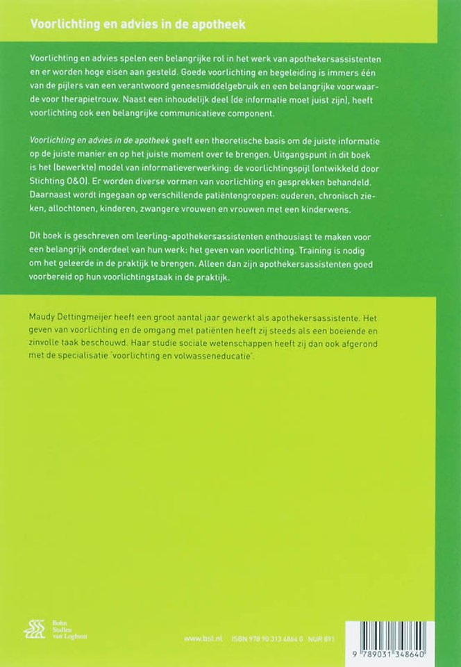 Voorlichting en advies in de apotheek geeft een theoretische basis om de juiste informatie op de juiste manier en op het juiste moment over te brengen. Uitgangspunt in dit boek is het (bewerkte) model van informatieverwerking: de voorlichtingspijl (ontwikkeld door Stichting O&O). Er worden diverse vormen van voorlichting en gesprekken behandeld. Daarnaast wordt ingegaan op verschillende patiëntengroepen: ouderen, chronisch zieken, allochtonen, kinderen, zwangere vrouwen en vrouwen met een kinderwens.