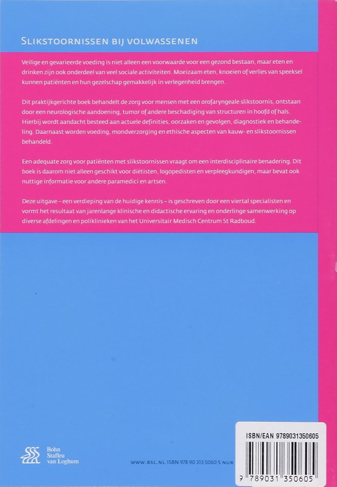 Dit praktijkgerichte boek behandelt de zorg voor mensen met een orofaryngeale slikstoornis, ontstaan door een neurologische aandoening, tumor of andere beschadiging van structuren in hoofd of hals. Hierbij wordt aandacht besteed aan actuele definities, oorzaken en gevolgen, diagnostiek en behandeling. Daarnaast worden voeding, mondverzorging en ethische aspecten van kauw en slikstoornissen behandeld.