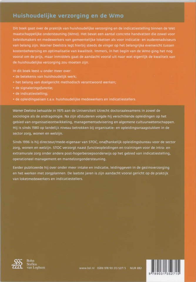 Dit boek gaat over de praktijk van huishoudelijke verzorging en de indicatiestelling binnen de Wet maatschappelijke ondersteuning (Wmo). Het bevat een aantal concrete handvatten die zowel voor beleidsmakers en medewerkers van gemeentelijke loketten als voor indicatie- en ouderenadviseurs van belang zijn.