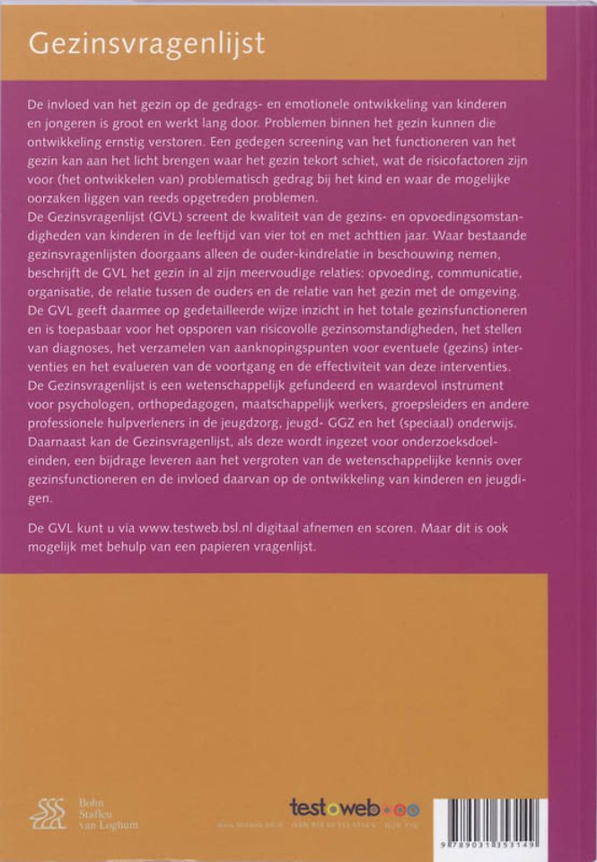 Doel van de testDe GVL meet de kwaliteit van gezins- en opvoedingsomstandigheden van kinderen in de leeftijd van 4 t/m 18 jaar. Gezinsomstandigheden hebben grote invloed op de gedrags- en emotionele ontwikkeling van kinderen en jongeren. Wanneer zich in een gezin problemen voordoen, kan dit de sociaal emotionele ontwikkeling van kinderen ernstig verstoren. In de jeugdzorg is men er inmiddels van doordrongen dat het behandelen van alleen de jeugdige niet voldoende is, maar dat ook altijd aandacht voor het gezin noodzakelijk is. Gezinsvragenlijsten screenen de opvoedingsinvloed van het gezin meestal alleen via de ouder-kind relatie. Het gezin bestaat echter uit meerdere relaties: ook de relatie tussen de ouders onderling en tussen het gezin en haar omgeving zijn onderdeel van het gezinssysteem. De Gezinsvragenlijst meet deze meervoudige gezinsrelaties en screent zowel het opvoedgedrag van de ouders als het functioneren van het gezin als geheel. Afname brengt aan het licht waar het gezin eventueel tekort schiet, wat de risico’s zijn op problematisch gedrag bij een kind en waar de mogelijke oorzaken liggen van problemen in het gezin. Afname van de GVL verschaft aanknopingspunten voor interventies.