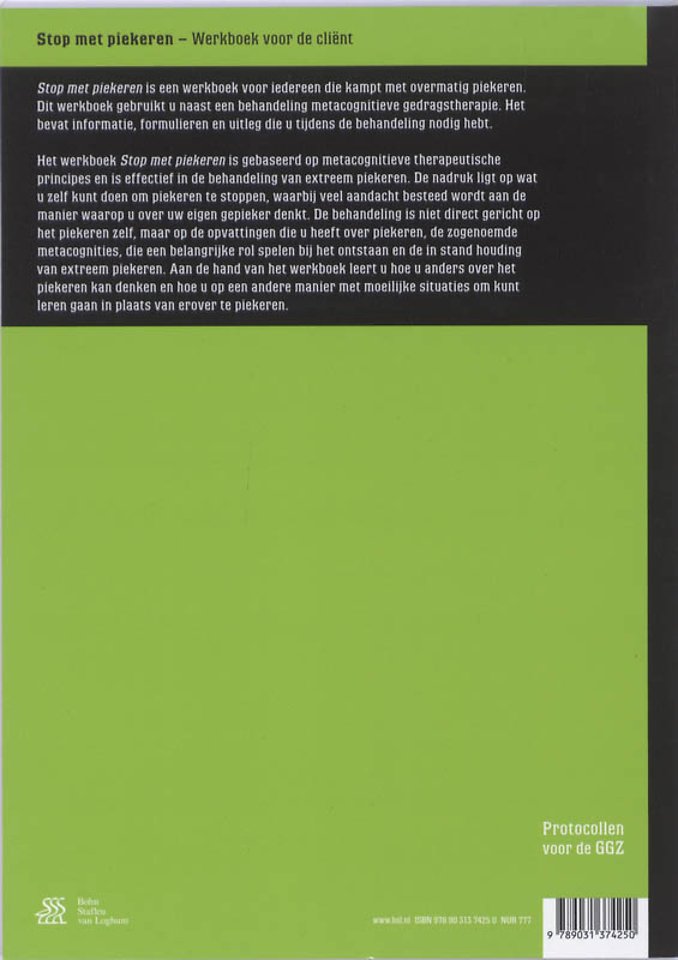 Stop met piekeren is een werkboek voor iedereen die kampt met overmatig piekeren. Dit werkboek wordt gebruikt door de cliënt naast een behandeling metacognitieve gedragstherapie (zie het protocol'Metacognitieve therapie bij gegeneraliseerde angst'.