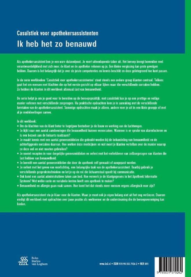 Als apothekersassistent ben je een ware duizendpoot. Je voert uiteenlopende taken uit. Het beroep brengt bovendien veel verantwoordelijkheid met zich mee: de klant en de apotheker rekenen op je. Een kleine vergissing kan grote gevolgen hebben. Daarom is het belangrijk dat je over de juiste competenties en kennis beschikt en deze geïntegreerd toe kunt passen.In de serie werkboeken ‘Casuïstiek voor apothekersassistenten’ staat steeds een andere groep klanten centraal. Telkens gaat het om mensen met klachten die op het eerste gezicht op elkaar lijken maar die verschillende oorzaken hebben. Zo hebben de klanten in dit werkboek allemaal last van benauwdheid.De serie helpt je om je goed voor te bereiden op de beroepspraktijk, met casuïstiek kun je op een prettige en veilige manier oefenen met verschillende zorgvragen. Via praktische opdrachten kom je in aanraking met de verschillende kerntaken van de apothekersassistent. Sommige opdrachten maak je alleen, andere voer je uit in een klein groepje of met al je medeleerlingen samen.In dit werkboek: • Om de klachten van de klant beter te begrijpen bestudeer je de bouw en werking van de luchtwegen.• Je kijkt naar een aantal aandoeningen die benauwdheid kunnen veroorzaken. Wanneer is er sprake van alarmfactoren en is een bezoek aan de huisarts raadzaam?• Je maakt kennis met een aantal geneesmiddelen die gebruikt worden bij de behandeling van benauwdheid en de achterliggende oorzaken daarvan. Hoe werken deze medicijnen en wat moet je klanten vertellen over de manier waarop ze deze wel en niet moeten gebruiken?• Je neemt recepten in voor dergelijke geneesmiddelen en oefent met het verhelderen van zelfzorgvragen van klanten die last hebben van benauwdheid.• Je bereidt een aantal geneesmiddelen die door de apotheek zelfgemaakt of aangepast worden.• Je oefent met het geven van voorlichting, een belangrijke taak van de apothekersassistent. Daarbij gebruik je verschillende gesprekstechnieken en let je op de rol die lichaamstaal speelt bij communicatie.• Ook komt een aantal administratieve taken aan bod. Hoe verwerk je de klantgegevens in het Apotheek Informatie Systeem? Met welke vaste en variabele kosten heeft een apotheek te maken?• Benauwdheid en allergie gaan vaak samen. Hoe komt het dat steeds meer mensen ergens allergisch voor zijn?Als apothekersassistent sta je klaar voor de klanten. Maar je moet ook je eigen belang niet uit het oog verliezen. Daarom eindigt dit werkboek met opdrachten over jouw positie als werknemer en de ondersteuning die de beroepsvereniging kan bieden.
