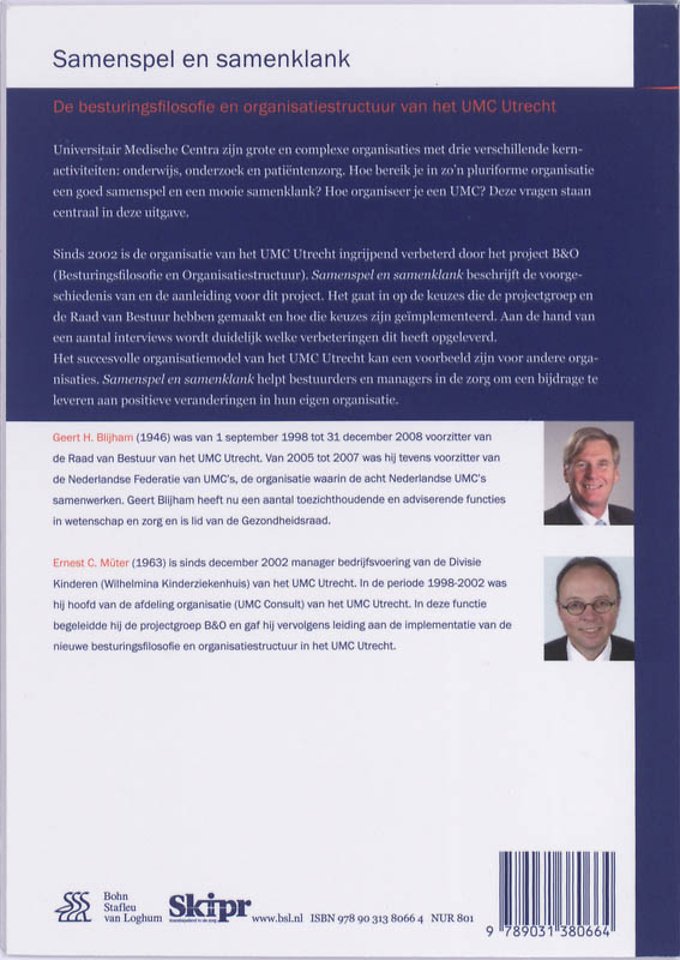 Universitair Medische Centra zijn grote en complexe organisaties met drie verschillende kernactiviteiten: onderwijs, onderzoek en patiëntenzorg. Hoe bereik je in zo’n pluriforme organisatie een goed samenspel en een mooie samenklank? Hoe organiseer je een UMC? Deze vragen staan centraal in deze uitgave. Sinds 2002 is de organisatie van het UMC Utrecht ingrijpend verbeterd door het project B&O (Besturingsfilosofie en Organisatiestructuur). Samenspel en samenklank beschrijft de voorgeschiedenis van en de aanleiding voor dit project. Het gaat in op de keuzes die de projectgroep en de Raad van Bestuur hebben gemaakt en hoe die keuzes zijn geïmplementeerd. Aan de hand van een aantal interviews wordt duidelijk welke verbeteringen dit heeft opgeleverd.Het succesvolle organisatiemodel van het UMC Utrecht kan een voorbeeld zijn voor andere organisaties. Samenspel en samenklank helpt bestuurders en managers in de zorg om een bijdrage te leveren aan positieve veranderingen in hun eigen organisatie.