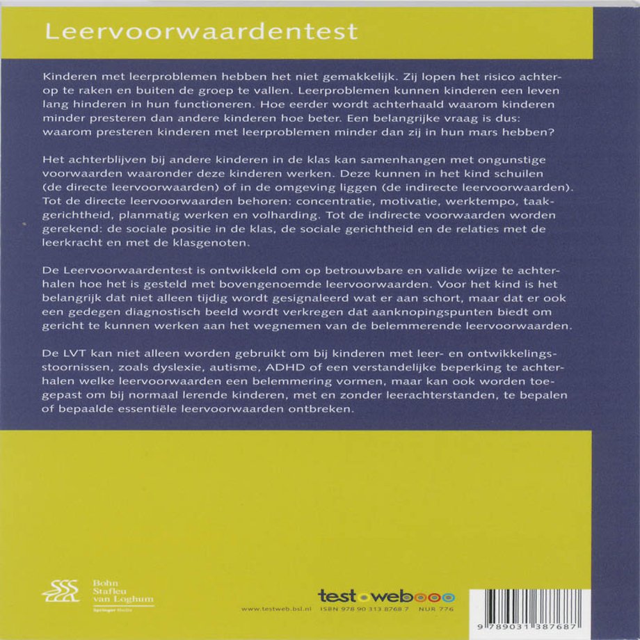 De Leervoorwaardentest (LVT) is ontwikkeld om op betrouwbare en valide wijze te achterhalen hoe het is gesteld met bovengenoemde leervoorwaarden. Voor het kind is het belangrijk dat tijdig wordt gesignaleerd wat er aan schort, zodat een gedegen diagnostisch beeld wordt verkregen dat aanknopingspunten biedt om gericht te kunnen werken aan het wegnemen van de belemmeringen.