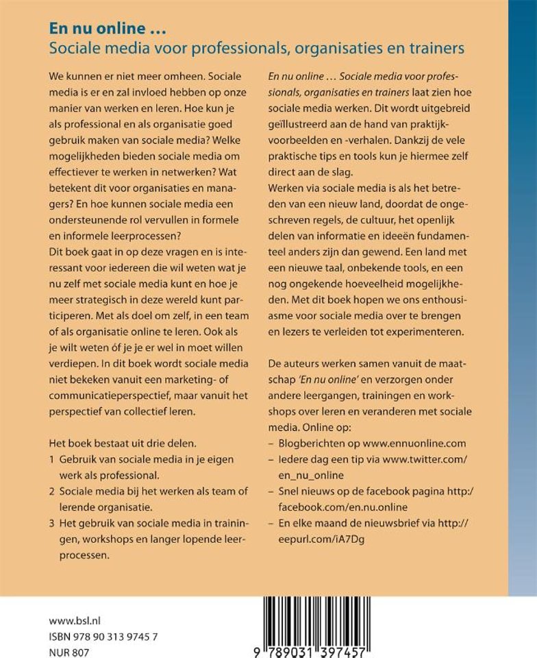'En nu online...Sociale media voor professionals, organisaties en facilitatoren' laat zien hoe sociale media werken. Dit wordt uitgebreid geïllustreerd aan de hand van praktijkvoorbeelden en -verhalen.