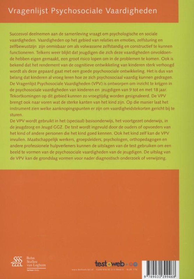 Doel van de testDe Vragenlijst Psychosociale Vaardigheden (VPV) geeft inzicht in de psychosociale vaardigheden van jeugdigen. Psychosociale vaardigheden zijn vaardigheden die nodig zijn om als volwassene zelfstandig en constructief aan de samenleving deel te nemen. Het gaat hierbij om interpersoonlijke vaardigheden (relationele en affectieve vaardigheden) en intrapersoonlijke vaardigheden (zelfsturing en zelfbewustzijn). De VPV wordt gebruikt om te na te gaan of jeugdigen goed zijn in deze vaardigheden of juist tekortschieten. Het instrument laat zien welke aanknopingspunten er zijn om mogelijke vaardigheidstekorten bij te sturen. Veel problemen en moeilijkheden zijn goed op te vangen door kinderen tijdig te helpen. De uitslag van de VPV vormt de grondslag vormen voor nader diagnostisch onderzoek, verwijzing naar jeugdzorg of training van de psychosociale vaardigheden.