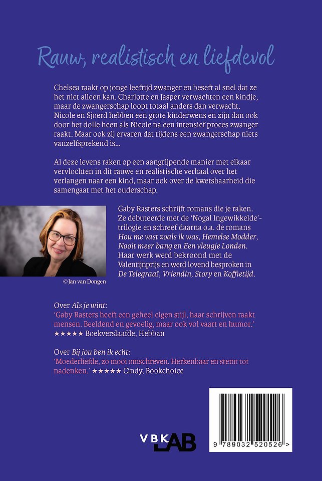 'Wenskind' van Gaby Rasters is een rauw en realistisch verhaal over het verlangen naar een kind maar ook over de kwetsbaarheid die samengaat met het ouderschap. Chelsea raakt op jonge leeftijd zwanger en beseft al snel dat ze het niet alleen kan. Charlotte en Jasper verwachten een kindje, maar de zwangerschap loopt totaal anders dan verwacht. Nicole en Sjoerd hebben een grote kinderwens en zijn dan ook door het dolle heen als Nicole na een intensief proces zwanger raakt. Maar ook zij ervaren dat tijdens een zwangerschap niets vanzelfsprekend is. Al deze levens raken in dit aangrijpende verhaal vervlochten en leveren een indrukwekkende roman op.