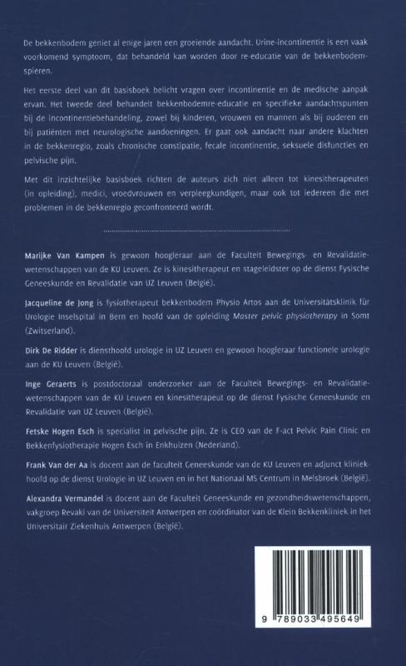 De bekkenbodem geniet al enige jaren een groeiende aandacht. Urine-incontinentie is een vaak voorkomend symptoom dat behandeld kan worden door reëducatie van de bekkenbodemspieren. Vragen rond incontinentie en de medische aanpak worden belicht in deel één. Deel twee richt zich op de bekkenbodemreëducatie. Hierin worden specifieke aandachtspunten bij de incontinentiebehandeling bij kinderen, mannen en vrouwen onder de loep genomen maar ook bij ouderen en neurologische aandoeningen. Door de groeiende aandacht voor andere klachten in de bekkenregio zoals chronische constipatie, fecale incontinentie, seksuele disfuncties en pelvische pijn belicht het boek ook deze indicatieterreinen.