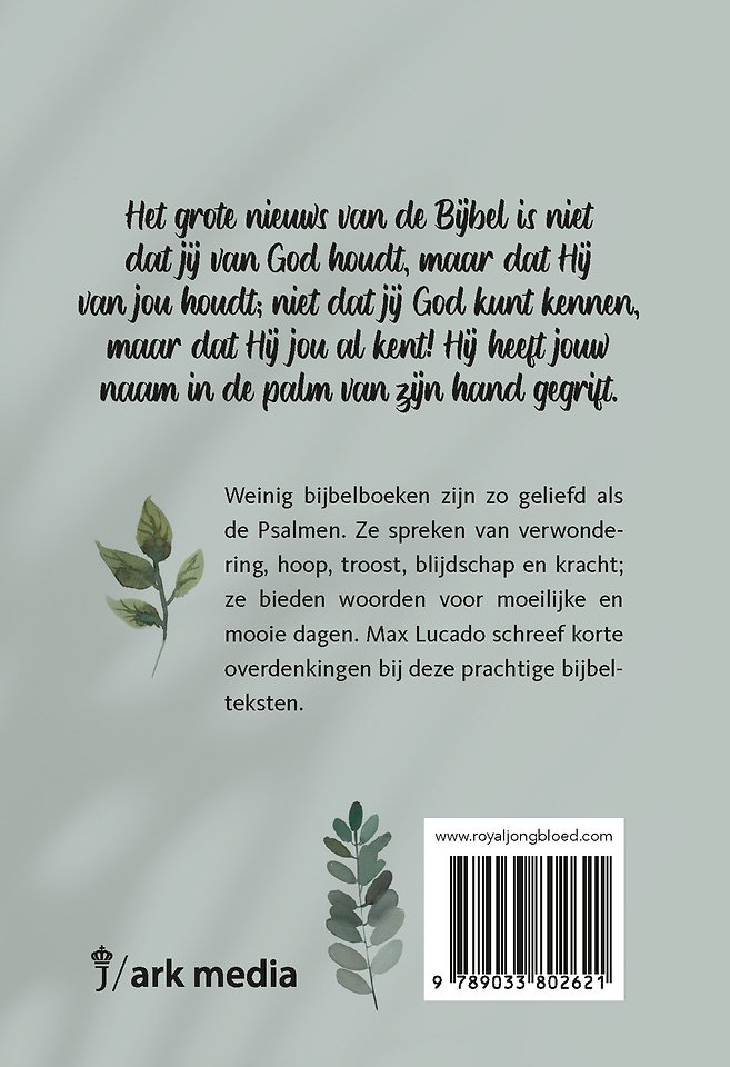 Het grote nieuws van de Bijbel is niet dat jij van God houdt, maar dat Hij van jou houdt; niet dat jij God kunt kennen, maar dat Hij jou al kent! Hij heeft jouw naam in de palm van zijn hand gegrift. Weinig bijbelboeken zijn zo geliefd als de psalmen. Ze spreken van verwondering, hoop, troost, blijdschap en kracht; ze bieden woorden voor moeilijke en mooie dagen. Max Lucado schreef korte overdenkingen bij deze prachtige bijbelteksten.