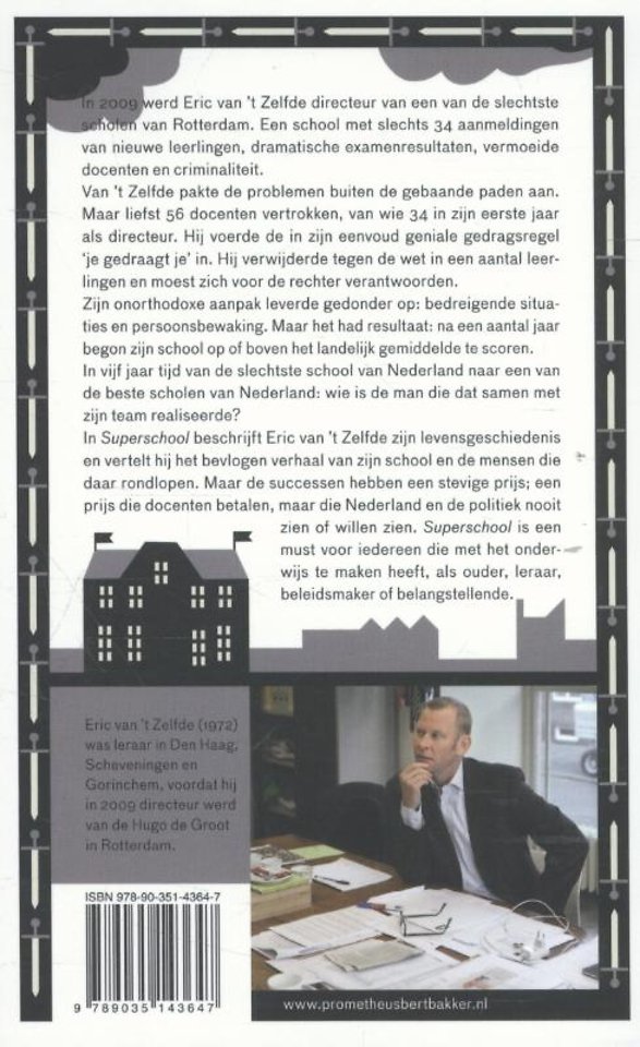 In 'Superschool' beschrijft Eric van 't Zelfde zijn levensgeschiedenis en vertelt hij het bevlogen verhaal van zijn school en de mensen die daar rondlopen. Maar de successen hebben een stevige prijs; een prijs die docenten betalen, maar die Nederland en de politiek nooit zien, of willen zien. Superschool is een must voor iedereen die met het onderwijs te maken heeft, als ouder, leraar, beleidsmaker of belangstellende.